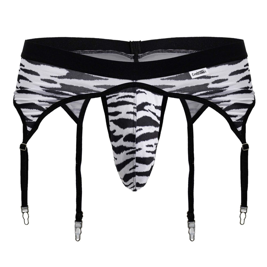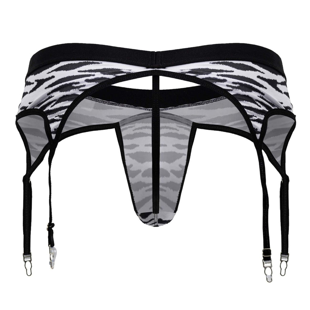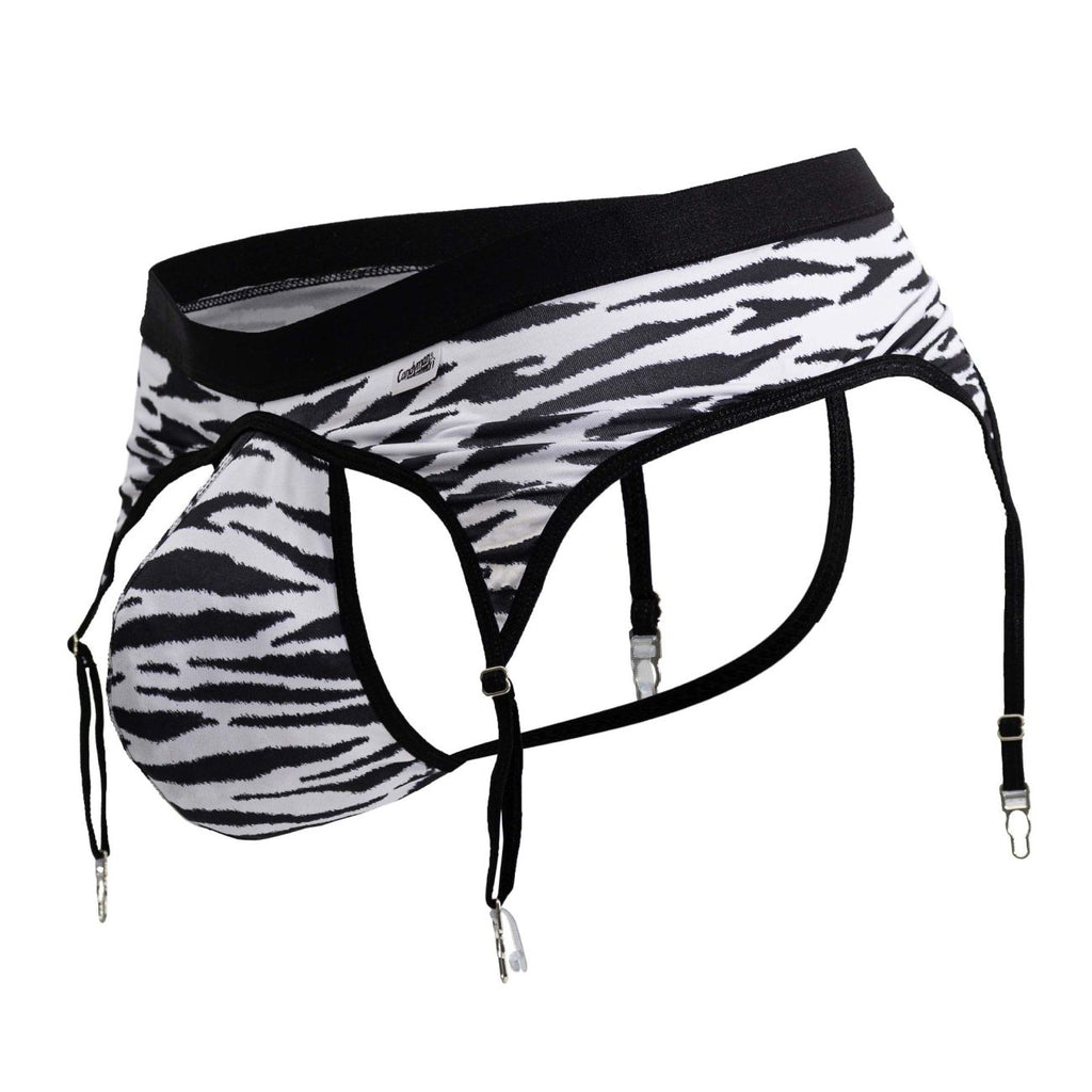 Make a fearless fashion statement with this men's garter brief. Featuring a bold black-and-white zebra pattern, detachable garter straps, and a sleek low-rise cut, it blends wild style with a sensual edge. The supportive pouch and stretchy fabric provide comfort while the adjustable garters invite you to pair it with your favorite thigh-highs for an unforgettable look.