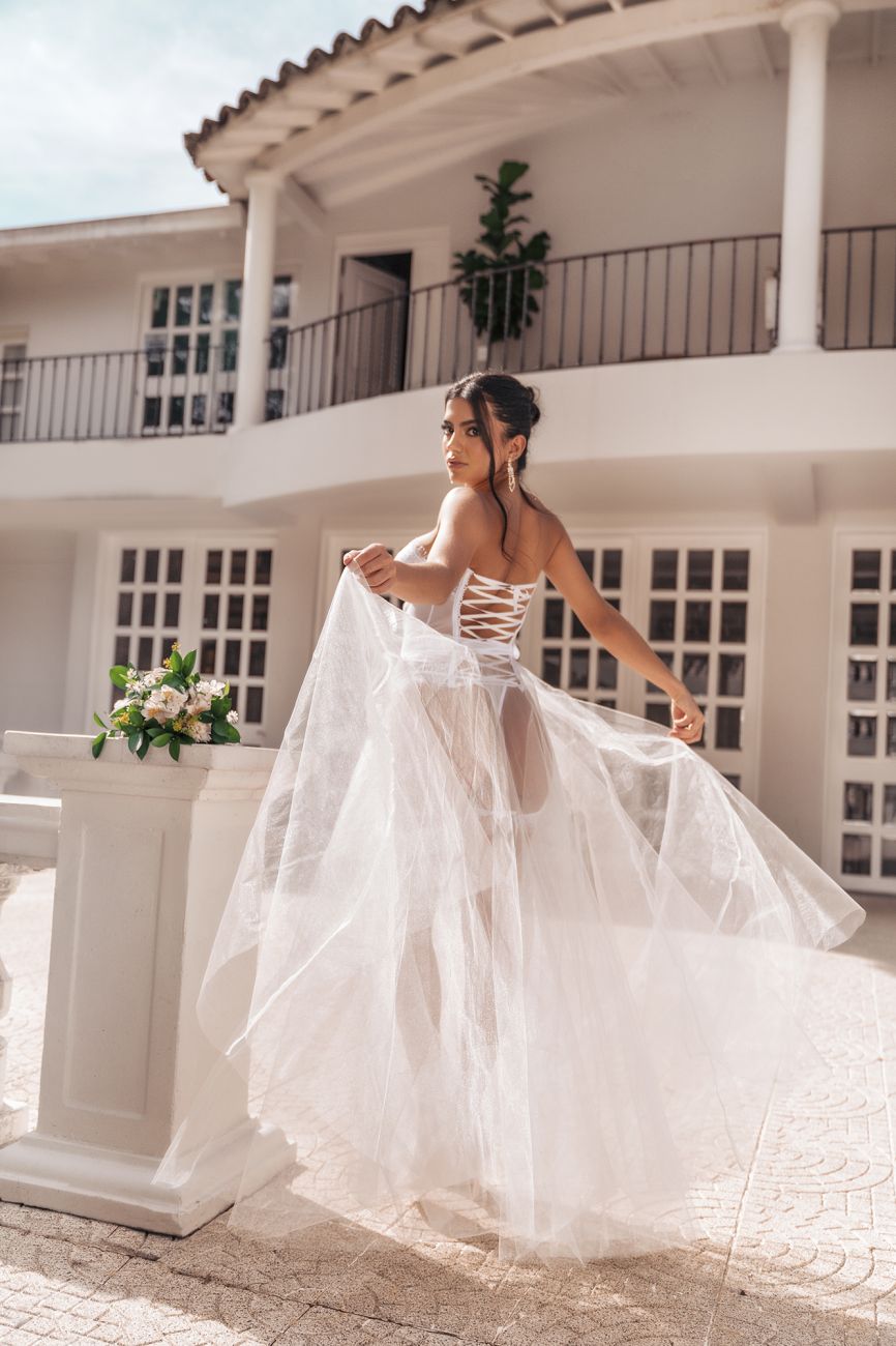 Elegance, romance, and sensuality come together in this stunning four-piece set. Crafted from white mesh with eyelash lace trims, it includes a full-length bustier with a seductive back lace-up design, a matching thong, and two garters that provide an alternative to the seductive look of stockings, offering the same allure without the need to wear them.