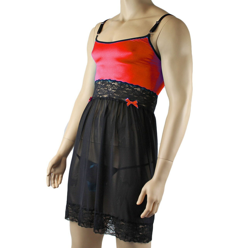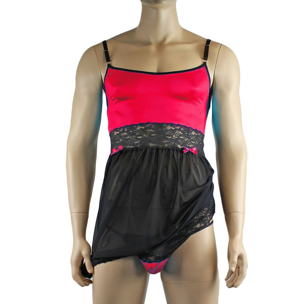 Mens Nightwear Chemise with stretch satin spandex top with attached lace and stretch mesh fabric, has adjustable shoulder straps and contrast bow accents. Easy to slip over the head or step into. Comes with matching G string