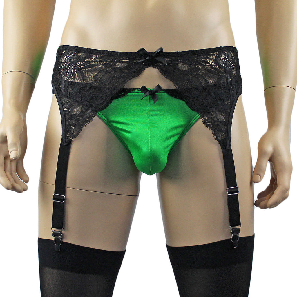 Mens stretch satin silky spandex lycra Garterbelt with wide floral stretch lace, has adjustable garters to hook onto your stockings. Comes with matching G string Thong with lace sides, pouch front and sexy back. Includes opaque Stockings.