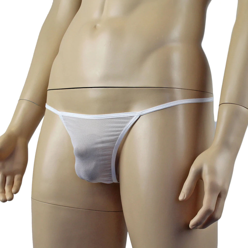Mens sheer see through mesh Pouch G string with thin elastic waist and back, no front seam, has a small contoured dart at the bottom.